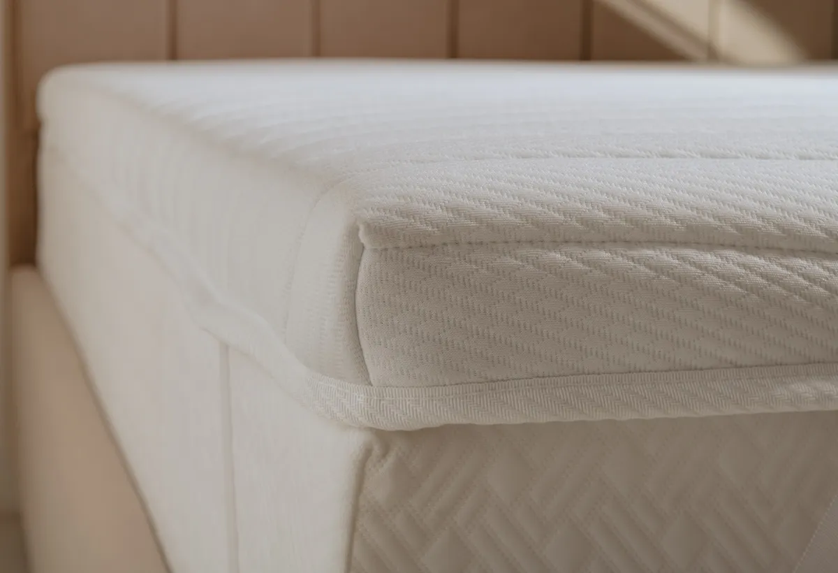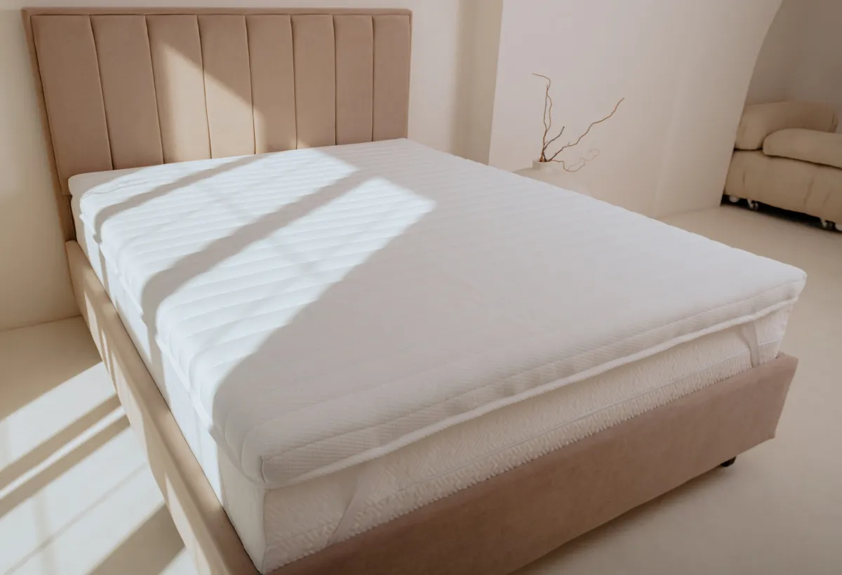 Этот топпер создан, чтобы помочь вам по-настоящему расслабиться. Он не жёсткий, а упругий и отзывчивый — тело на нём не проваливается, а мягко поддерживается. Всё дело в двух слоях пены. Нижний, 2 см, — это плотная основа для поддержки. Верхний, 3 см, — пена с рельефной поверхностью. Она создаёт лёгкий массажный эффект, который помогает снять напряжение после долгого дня. Это не интенсивный массаж, а скорее приятное покалывание для расслабления. Вместе они создают комфортную среднюю жёсткость. А стёганый чехол сверху делает поверхность приятной на ощупь.